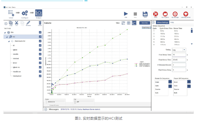 4200A-SCS系統(tǒng)提供的標配軟件Clarius包括一組用于WLR測試的項目。這些項目包括一個具有可配置的測試級和項目級的應(yīng)力測量循環(huán),以及一個用于在晶圓上每個site上進行測試的循環(huán)項目。圖3顯示了HCI范例項目。該圖顯示了某一個特定的參數(shù)隨時間推移而被測試,每個點代表一個應(yīng)力周期后不同的測量。左邊的窗口是測試序列,顯示了測試的順序和項目的整體結(jié)構(gòu)。在Clarius項目庫中中有幾個用于WLR測試的項目,包括 :