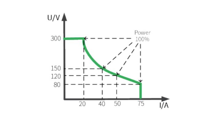 N38300系列直流電源輸出采用寬范圍設(shè)計,單臺電源可以在額定輸出功率下,輸出更寬范圍的電壓和電流,滿足工程師對多種電壓/電流等級產(chǎn)品測試應(yīng)用場景,大幅降低實驗室或自動化測試系統(tǒng)中電源成本及占用空間。以其中一個型號N38306-300-75為例,電源輸出功率為6000W,最大輸出電壓和輸出電流分別達到了300V和75A,使得N38300適用范圍比傳統(tǒng)電源更廣泛。
