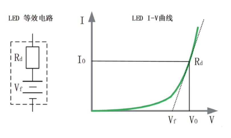 LED驅(qū)動(dòng)電源是恒流源,輸出電流穩(wěn)定且不能大于LED額定電流,以避免加速LED衰老損壞。LED等效為電阻Rd與電壓源Vf的串聯(lián),其I-V曲線在工作點(diǎn)(V0,I0)處的切線與真實(shí)LED非線性I-V曲線等效。由于LED的I-V曲線是非線性的,對(duì)于LED電源的測(cè)試需求,常規(guī)的電子負(fù)載CR或CV模式并不適合,因此需要采用更復(fù)雜的負(fù)載模型來(lái)模擬LED的行為。