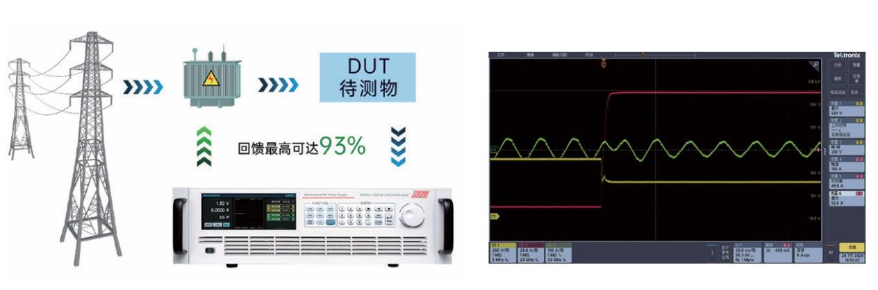 在純負(fù)載模式下,N35500既能實現(xiàn)對外提供功率,又可以吸收功率,并將電能返回至電網(wǎng),回饋效率高達(dá)93%,可廣泛適用于鋰電池、UPS、BOBC等設(shè)備測試。