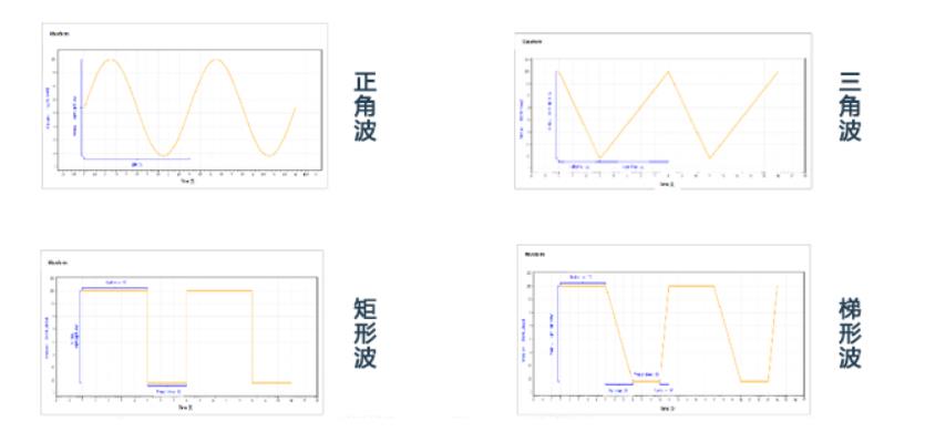 具備函數(shù)編輯功能,可通過設(shè)置峰值,谷值,峰值/谷值時間,上升/下降時間,周期時間等參數(shù),生成正弦波,三角波,矩形波,梯形波等波形,滿足研發(fā)測試,法規(guī)測試認證,產(chǎn)線測試等多個應(yīng)用場景的個性化測試需求。