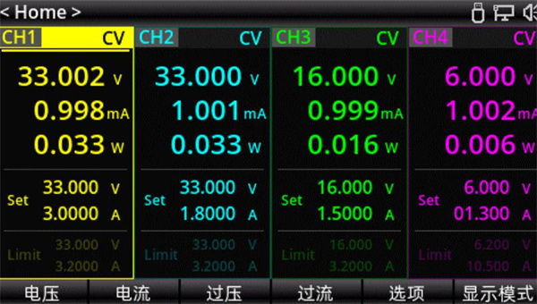 UDP4303S可編程線性直流電源設(shè)計(jì)4個獨(dú)立通道。CH1/CH2能夠提供32V/3A輸出,支持一鍵等性能串并聯(lián);CH3獨(dú)立通道提供15V/3A輸出,CH4獨(dú)立通道提供6V/10A輸出。該直流電源具備4通道電壓、電流、功率波形實(shí)時顯示功能