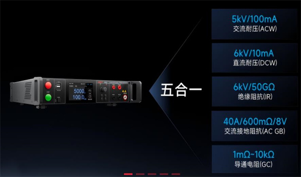 UT5400系列集交流耐壓測(cè)試、直流耐壓測(cè)試、絕緣阻抗測(cè)試、交流接地阻抗測(cè)試及導(dǎo)通電阻測(cè)試五大功能于一體,交流耐壓測(cè)試高達(dá)5kV/100mA,絕緣阻抗測(cè)試高達(dá)6kV/50GΩ,電壓電流精度高達(dá)1%,分辨率高達(dá)1V/0.1nA,測(cè)量