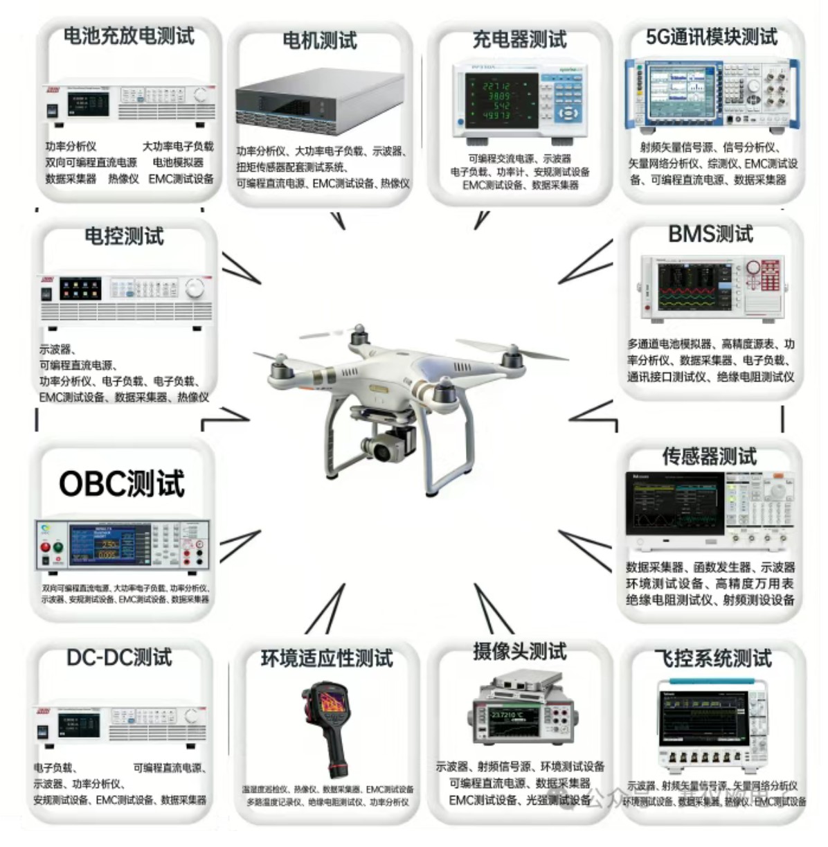 這些要素構成低空經(jīng)濟底層邏輯,其實施需電子測試設備保駕護航。以下以無人機為例,羅列所需要的測試裝備: