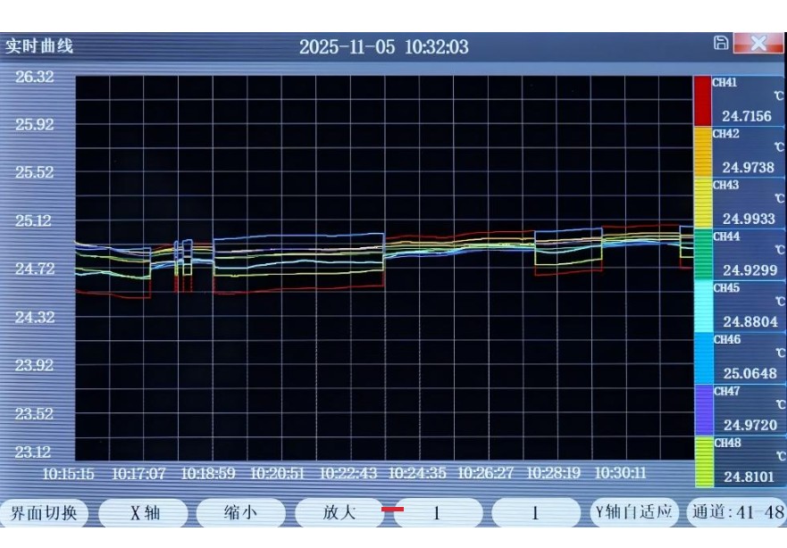 該界面顯示同一模塊的8個(gè)通道數(shù)據(jù)的變化趨勢(shì),右邊為采集到的實(shí)時(shí)數(shù)據(jù),同時(shí)例舉出每個(gè)通道在曲線圖中選用的顏色。橫軸代表時(shí)間,縱軸代表采集到的數(shù)據(jù)。點(diǎn)擊曲線操作按鈕,可對(duì)曲線進(jìn)行相應(yīng)的操作,如放大、縮小、修改坐標(biāo)軸、切換通道。
