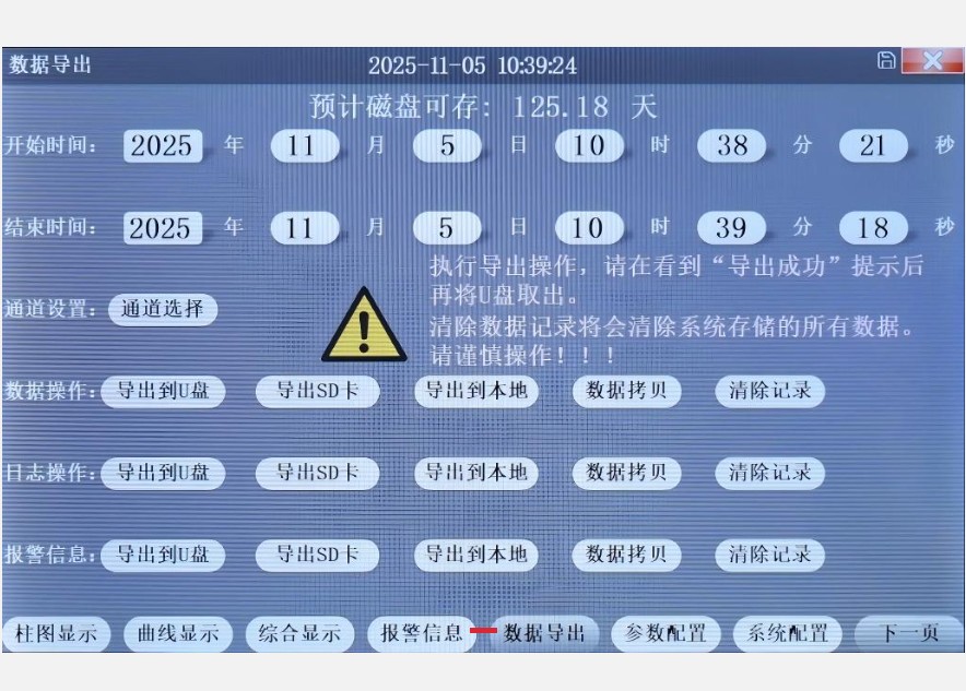 想將儀器內(nèi)部存儲(chǔ)的數(shù)據(jù)導(dǎo)出,首先需要設(shè)置開始時(shí)間和結(jié)束時(shí)間,儀器會(huì)根據(jù)用戶所設(shè)置的時(shí)間范圍來查找相應(yīng)的數(shù)據(jù),然后按照用戶需求導(dǎo)出到指定磁盤。頁面的上方的預(yù)計(jì)磁盤可存時(shí)間,是依據(jù)磁盤剩余空間大小計(jì)算儀器一直采集并能存儲(chǔ)所有數(shù)據(jù)的最長(zhǎng)時(shí)間。