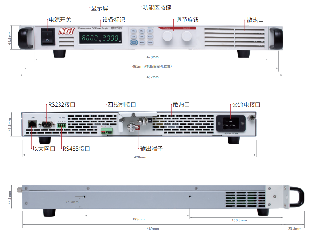 N39100系列可編程直流電源是一款高可靠性、高功率密度的程控電源,采用薄型設計,標準19英寸1U機箱,方便上架安裝。
