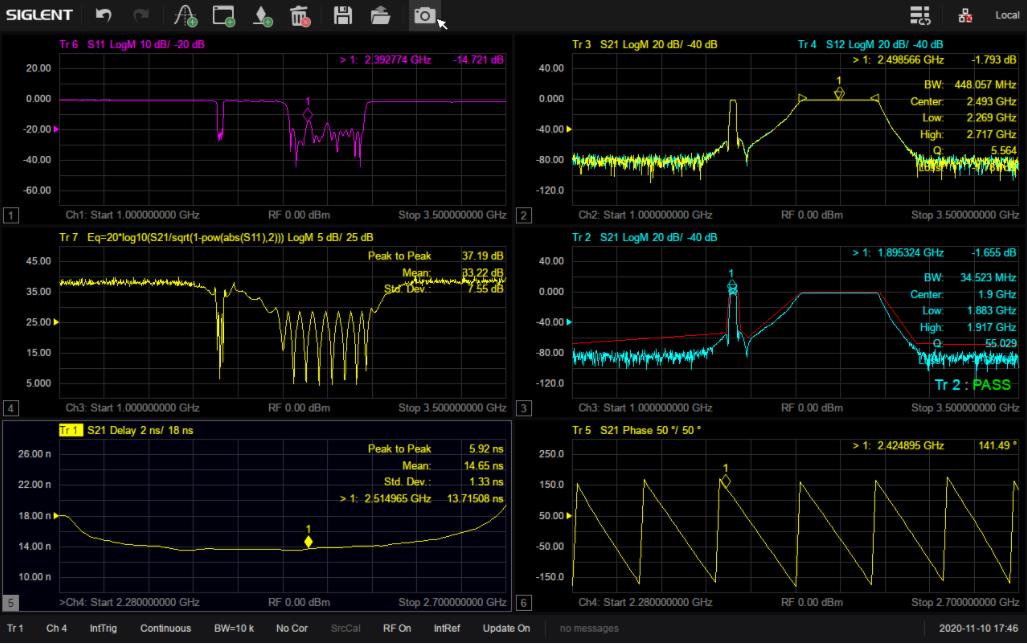 SNA5000X系列支持在多個窗口添加多條跡線進行全4端口S參數(shù)測試,并且具備多種顯示格式,比如 Log Mag,Lin Mag,Phase,Delay,Smith,SWR,Polar等,可以方便快捷地分析被測物的傳輸系數(shù),反射系數(shù),駐波比,阻抗匹配,相位,延時等參數(shù)。在生產(chǎn)線驗證天線,濾波器等的特性時,還可以保存參考跡線或者添加Limit模板進行通過失敗測試,有利于提高生產(chǎn)效率。