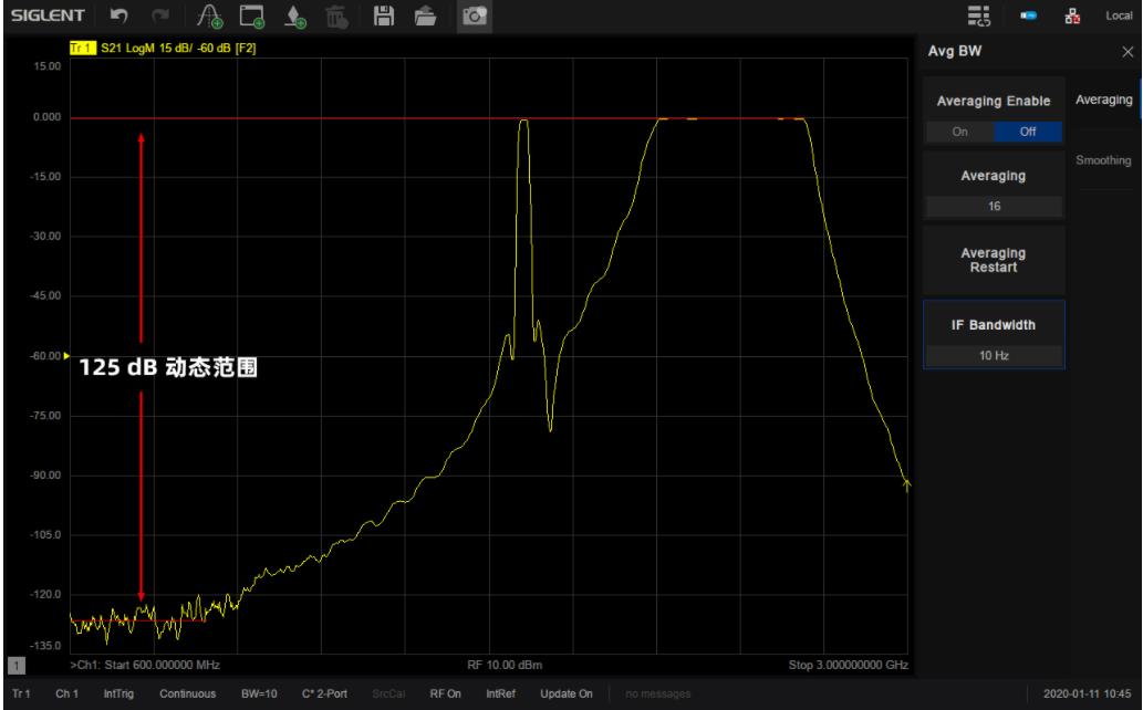 系統(tǒng)動態(tài)范圍是VNA一個非常重要的指標,它是VNA源的最大輸出功率與測試端口本底噪聲的差值。SNA5000X的動態(tài)范圍可達125 dB@10Hz IFBW,接收機噪底-125 dBm/Hz,可適用于對動態(tài)范圍要求比較高的測試場景,比如同時測量濾波器的通帶和帶外抑制性能。