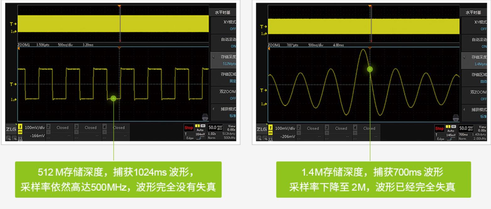 如果存儲(chǔ)深度不足,高采樣率的情況下只能捕獲一小段波形,ZDS5054Pro標(biāo)配512M超大存儲(chǔ)深度,捕獲1024ms波形的情況下,依然可以保持100M/s采樣率。