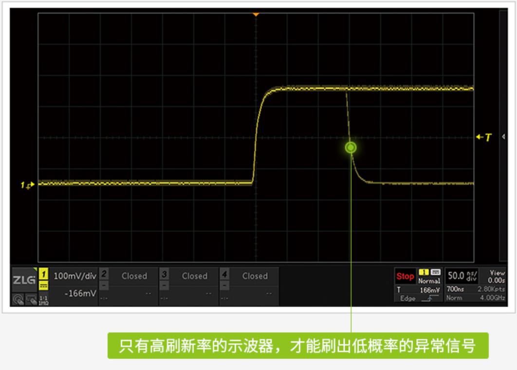 示波器波形刷新率越高,死區(qū)時(shí)間就越短,可以更快發(fā)現(xiàn)偶發(fā)性的異常信號(hào)。ZDS5054Pro示波器突破100萬次/秒波形刷新率,讓工程師快速發(fā)現(xiàn)異常信號(hào)。