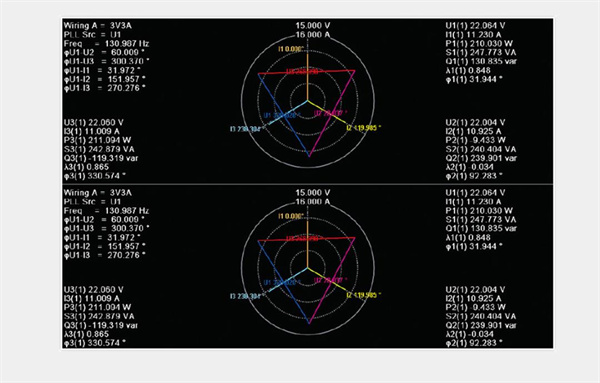 PA5000H功率分析儀可同時(shí)測(cè)量并顯示變頻器輸入三相與輸出三相的矢量圖,可對(duì)輸入、輸出各相間的相角關(guān)系進(jìn)行分析,準(zhǔn)確評(píng)估出輸入信號(hào)對(duì)輸出信號(hào)的角差影響。(所有型號(hào)均能滿足)